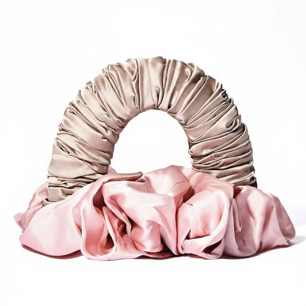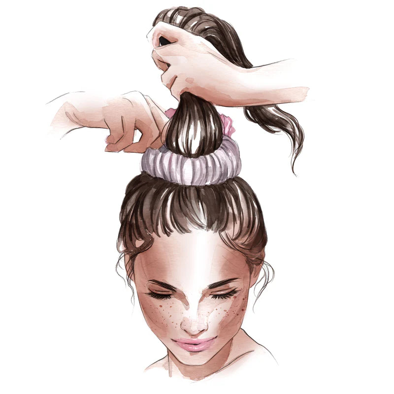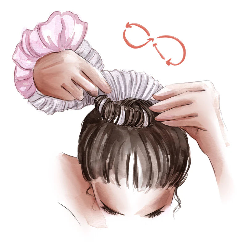 Sujeta el arco cubierto de cabello con una mano, luego toma ambos extremos del scrunchie para formar una figura en forma de 8 y pásalo por encima del arco para asegurar el moño.